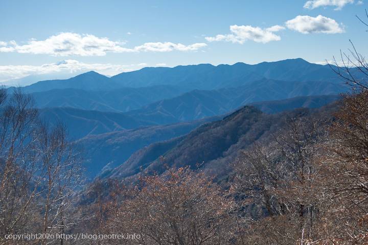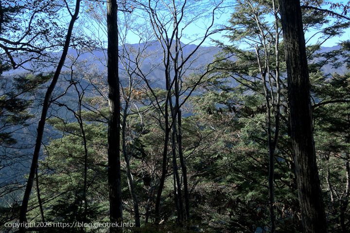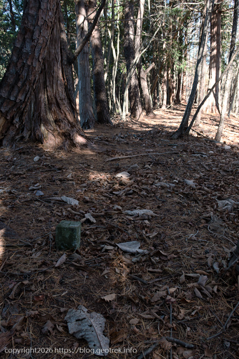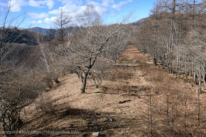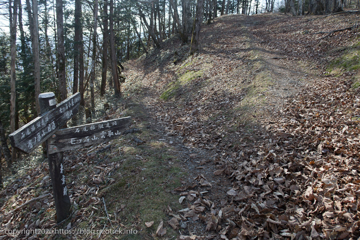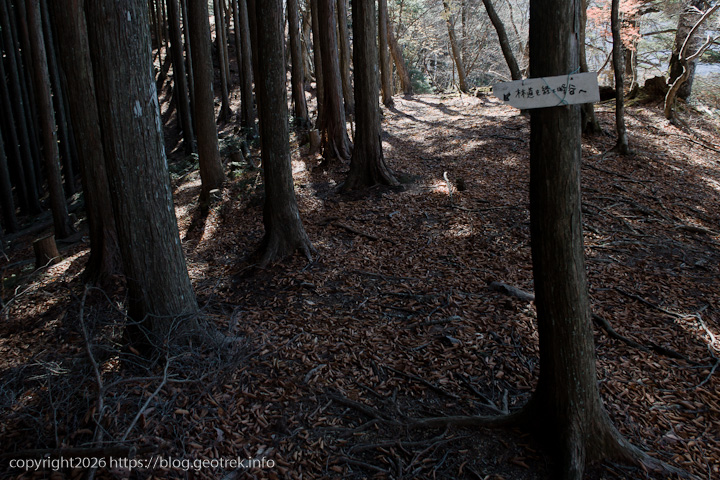 だらだらと長い登り。落ち葉が多く、踏み跡不明瞭で歩きにくい。ここまでで落ち葉が一番深いかもしれない。