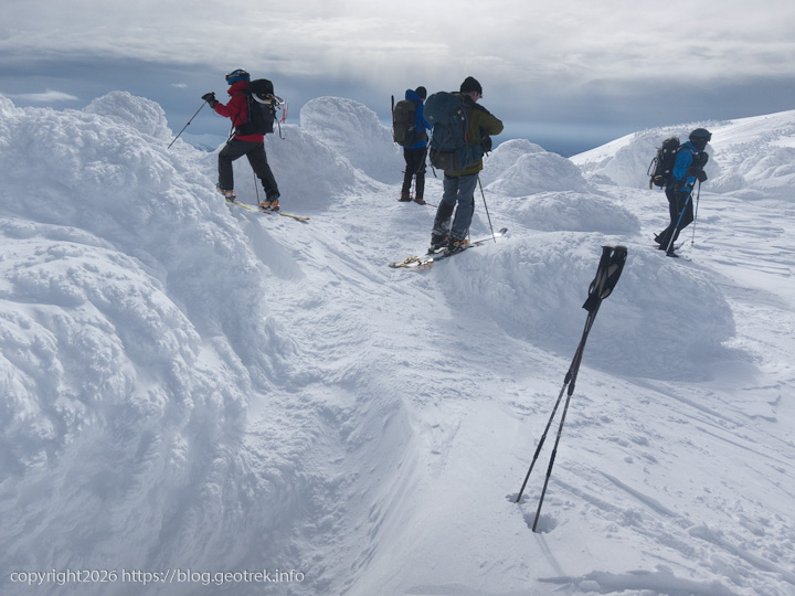 難所?を振り返る。例年ならば進行方向右が崖、左も急な斜面の緊張する細いリッジ。しかし、今年は雪がたっぷりついていて難なく通過。