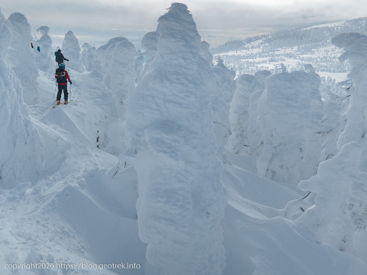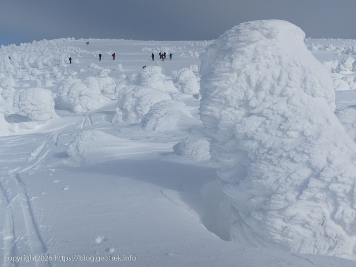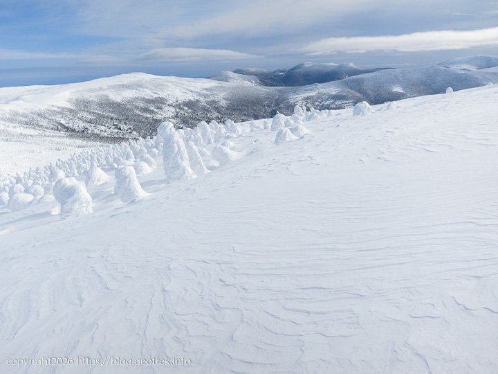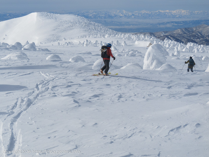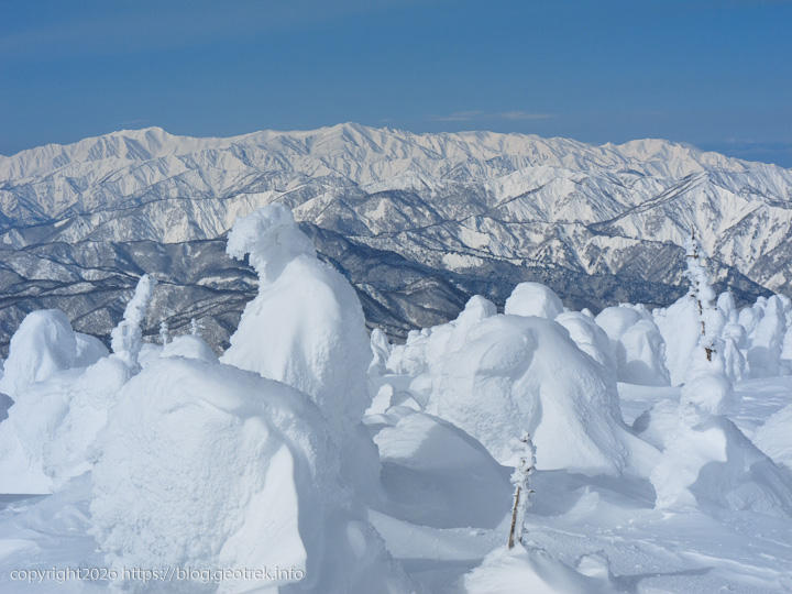 樹氷越しに遠くの山が白くくっきりと見えた。あれはたぶん飯豊連峰だ。無数の白いモンスターの向こうに稜線が折り重なる。これだけ見渡せる冬の日は滅多にないだろう。