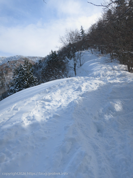 若女平の末端から樹林の斜面を滑り降り、いよいよ最大の難所へ。木々の向こうには斜面が急に切れ落ちているのが見える。